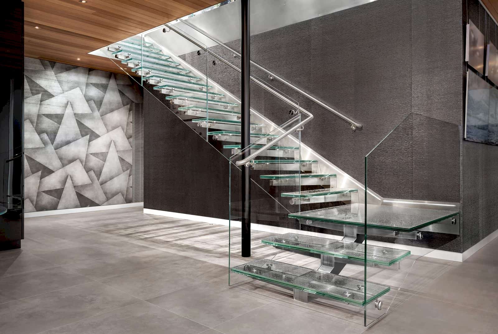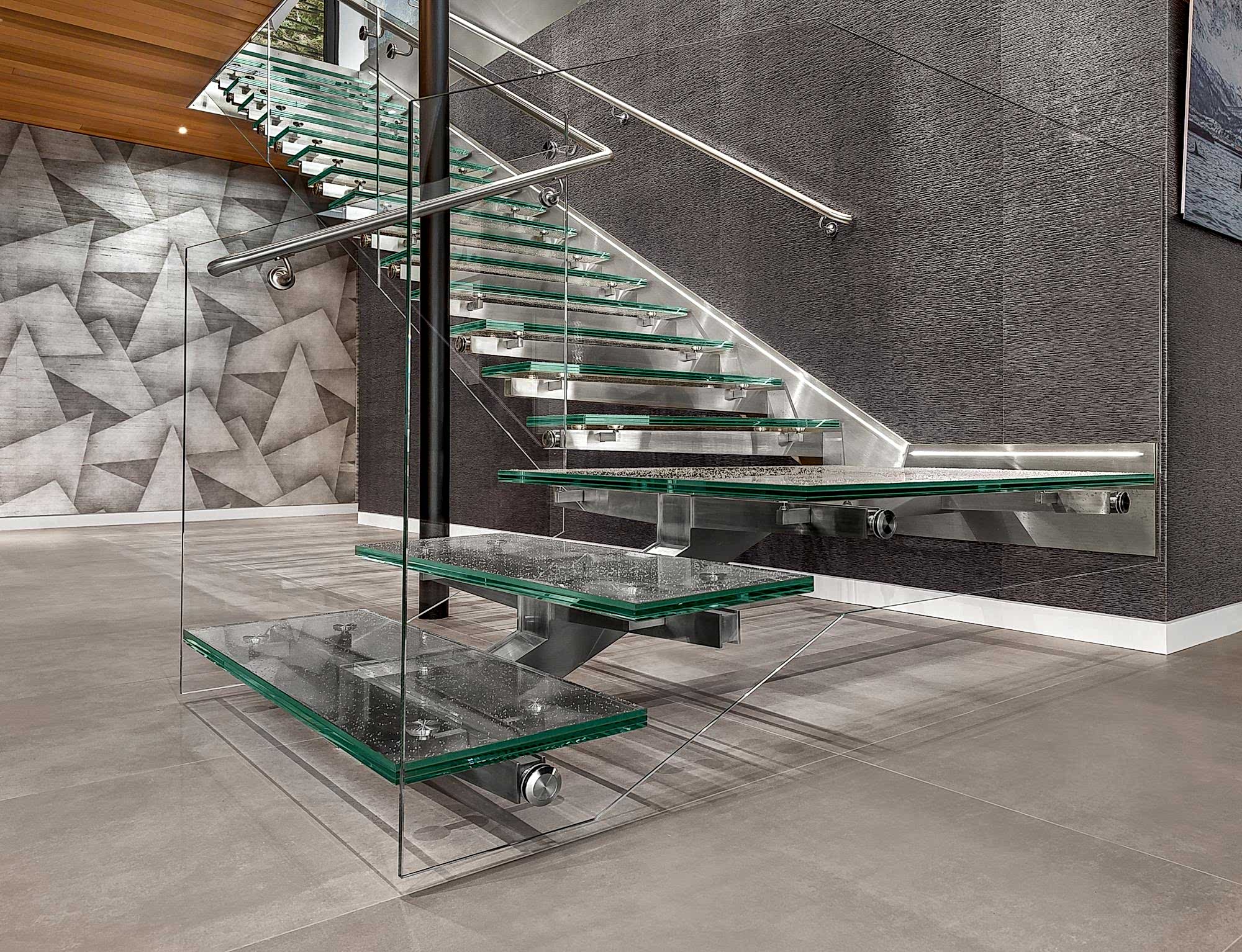 Merdiven yan camları tek cam olarak veya lamine cam olarak tercih edilebilir. Güvenlik açısından temperlenmiş lamine cam kullanılması gerekmektedir. Merdiven camlarında ayrıca 3 lü lamine